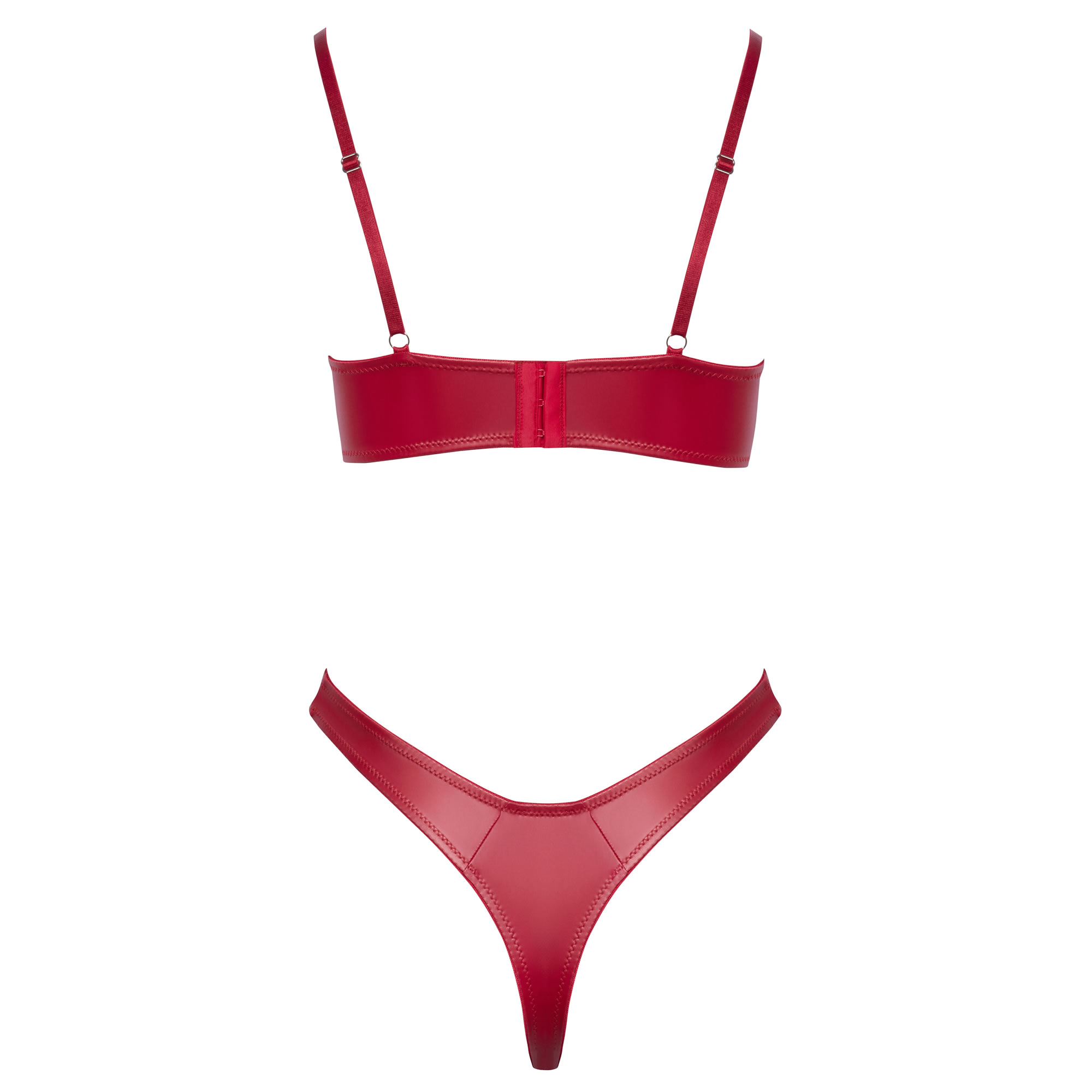 Sættet består af en bøjle-bh og en g-streng, begge i en dyb rød wetlook-finish, der smyger sig om kroppen og fremhæver dine kurver.