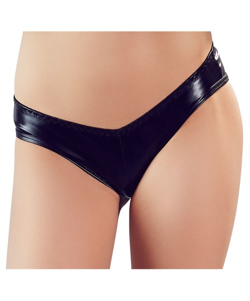 Fronten har et klassisk, sort design i skinnende wetlook-materiale, der smyger sig stramt ind til huden og giver en glat, sofistikeret finish. Bagpå afsløres hemmeligheden: et sexet cage-design med flere cut outs, som blottet og indrammer bagdelen for maksimal visuel effekt.