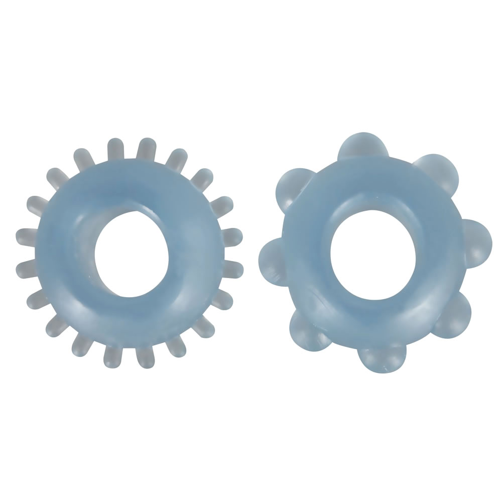 Hold erektionen længere med de to transparent-blå penisringe med nopper i forskellig størrelse.