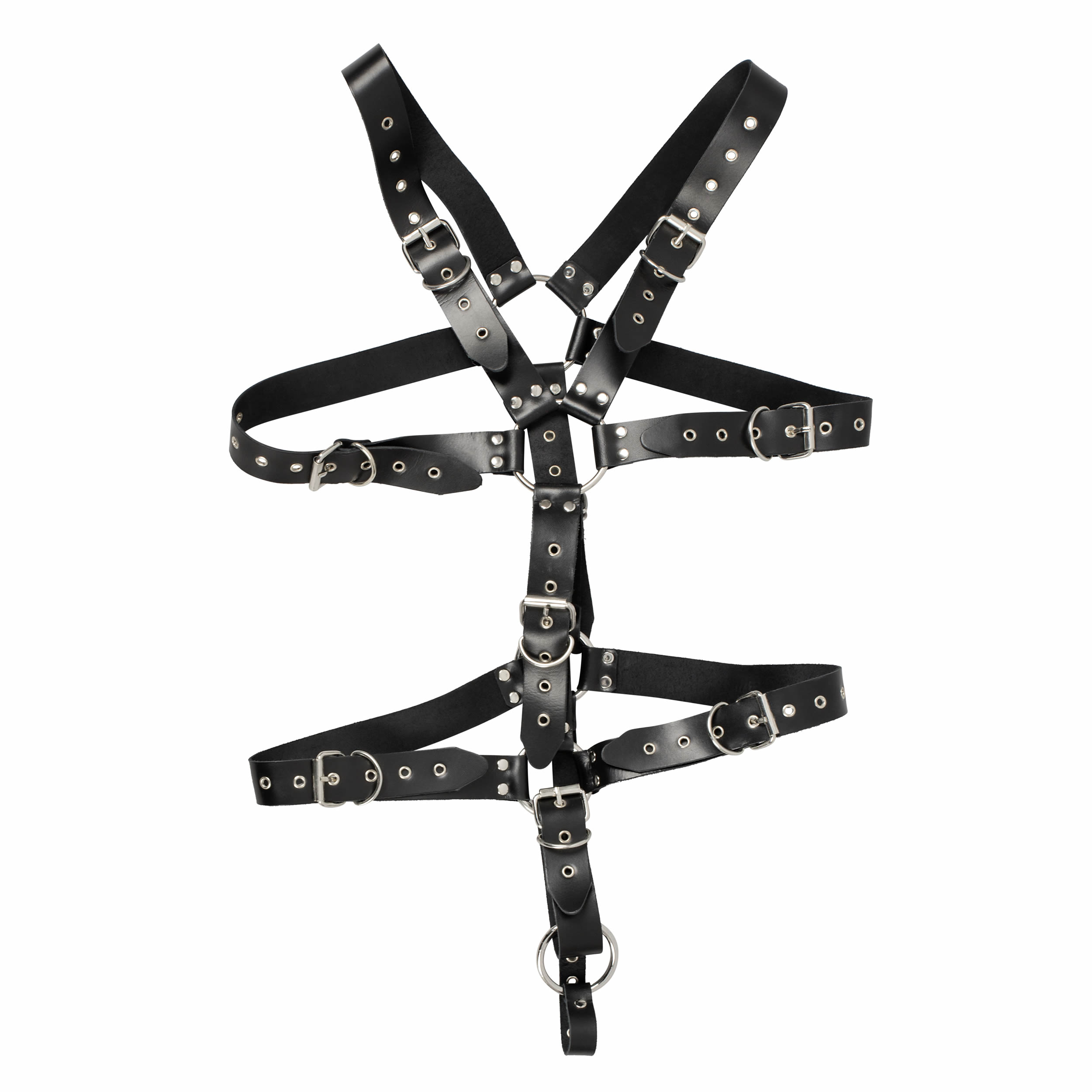 Rembody lavet af sorte læderrem med nitter og forbindelsesringe i stål.